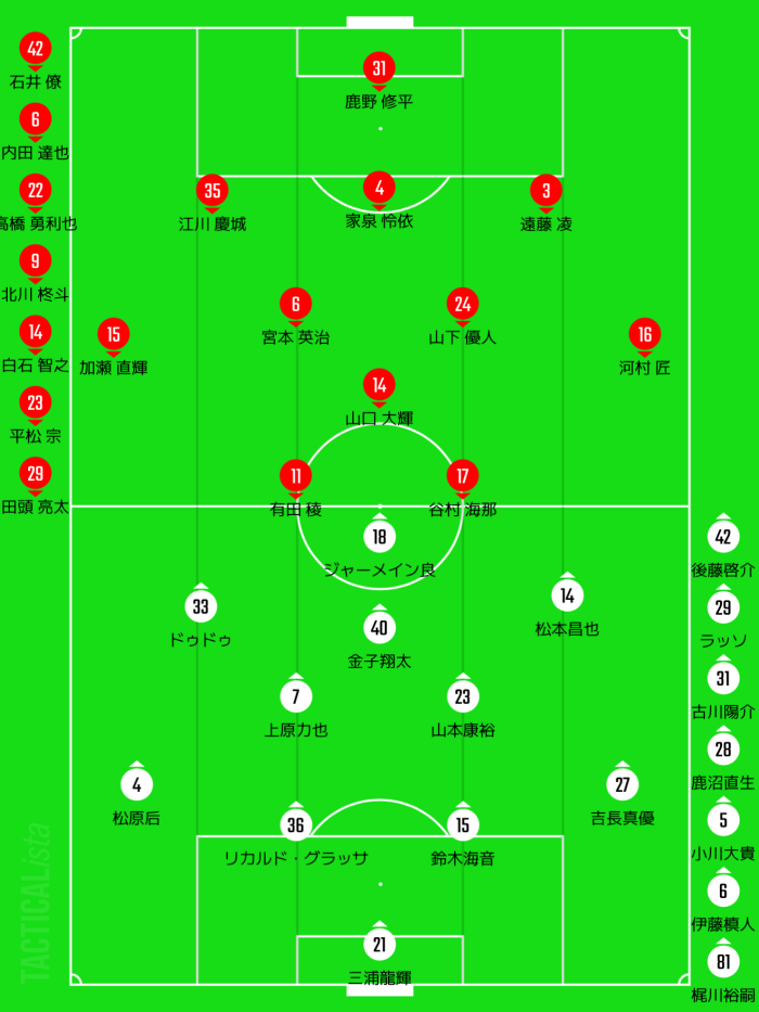 カップ戦では吉長真優が入る事が多かったので、予想スタメンでは彼をスタメン予想しましたが、松本昌也を右サイドバックに起用し、2列目に山田・古川・藤川らを起用する可能性もあります。