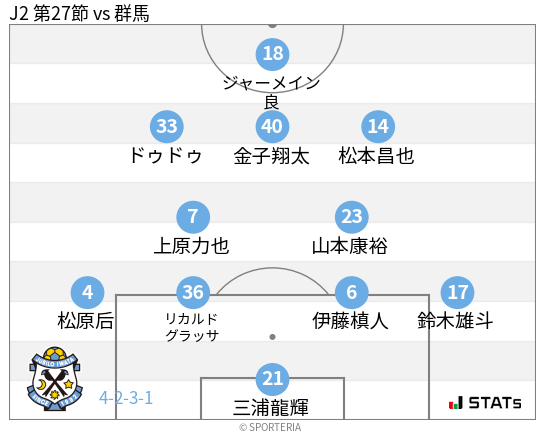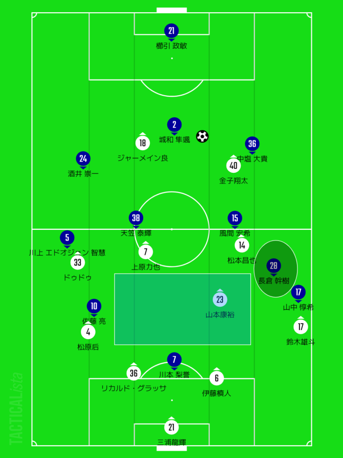 前からのプレスは諦め、群馬ボランチをジャメ・金子翔太が見て、シャドーを力也・康裕が、サイドの選手を昌也・ドゥドゥが見る形に。