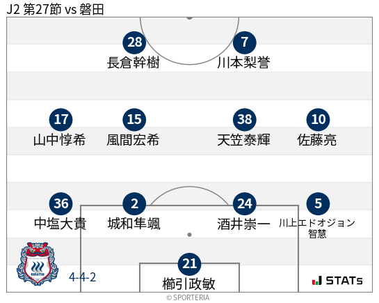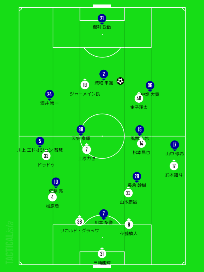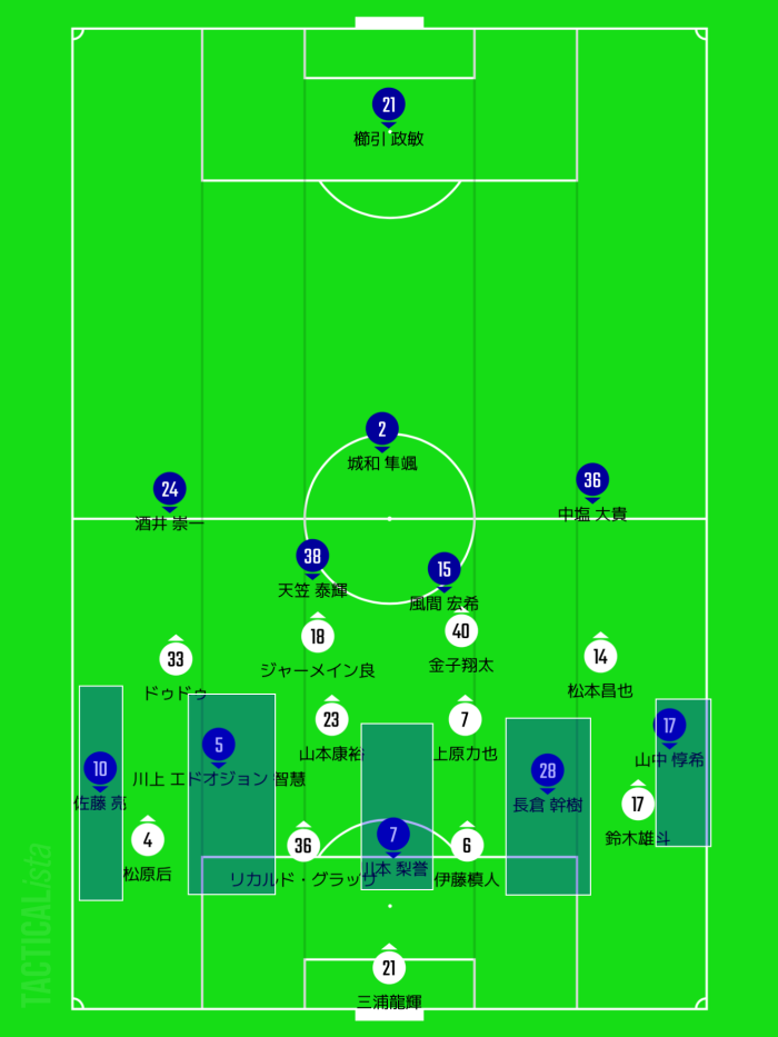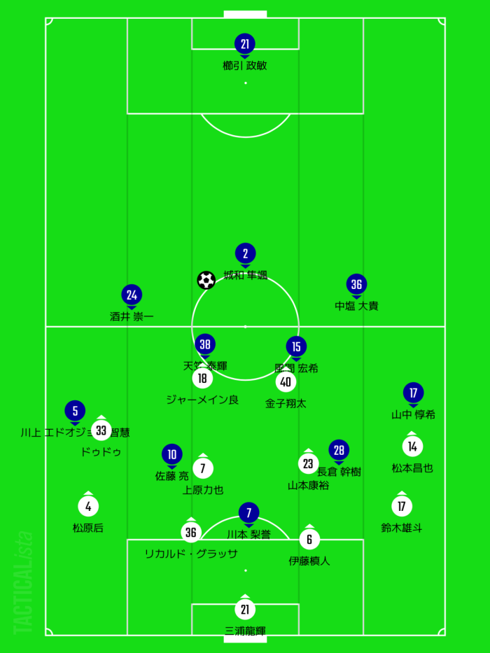 磐田は山田大記が外れ金子翔太がトップ下、松本昌也が右サイドに入りました。
