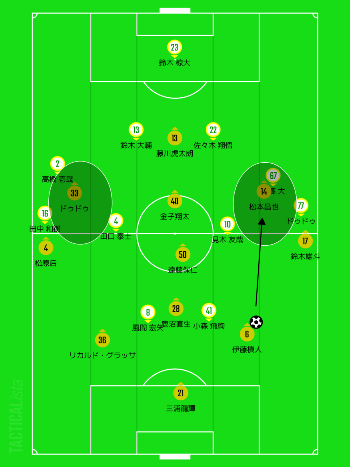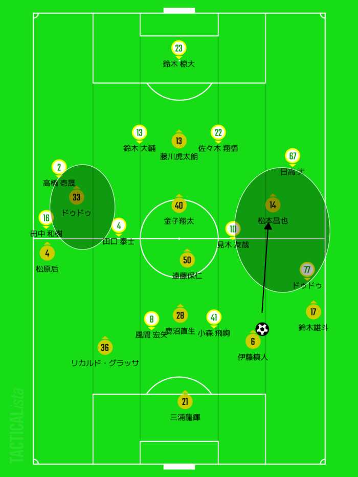 当然千葉のサイドハーフがマークに来るのですが、そう来たら磐田としてはドゥドゥ・松本昌也のサイドハーフが中に入り、中間ポジションで起点を作りたい。
