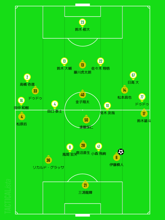 鈴木雄斗が最初から高い位置を取らなければ相手ディフェンスも広がり、中間ポジションでボールを受けやすかったのではないかと思います。