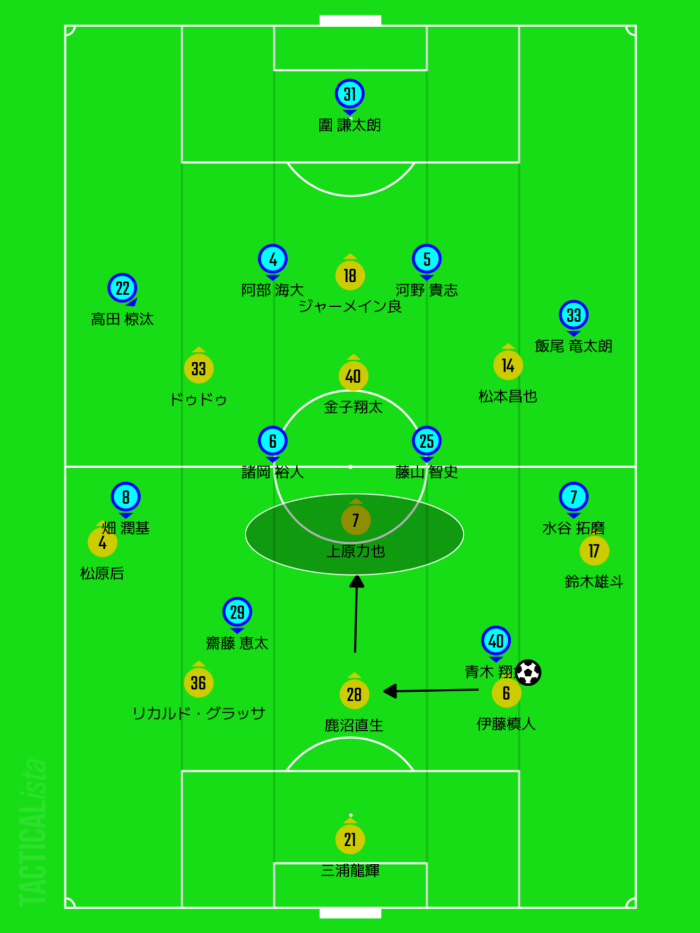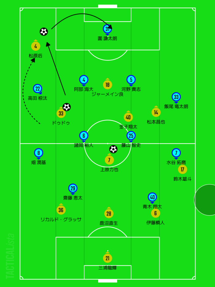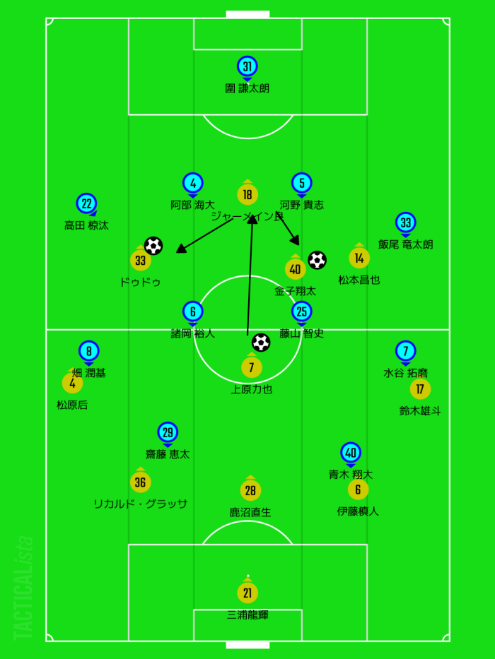 (上原からジャメに当ててドゥドゥや金子に前向きで受けさせる)