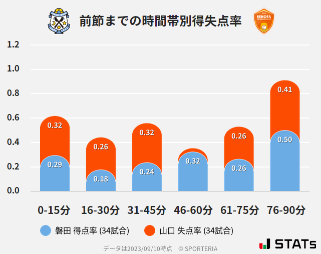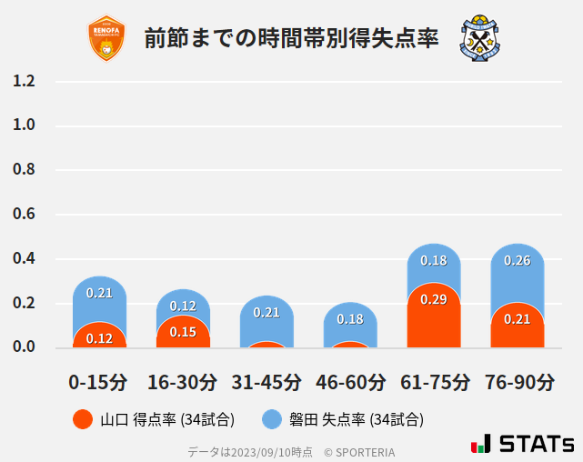 磐田の得点は46-60分以外で高確率で生まれるデータに。