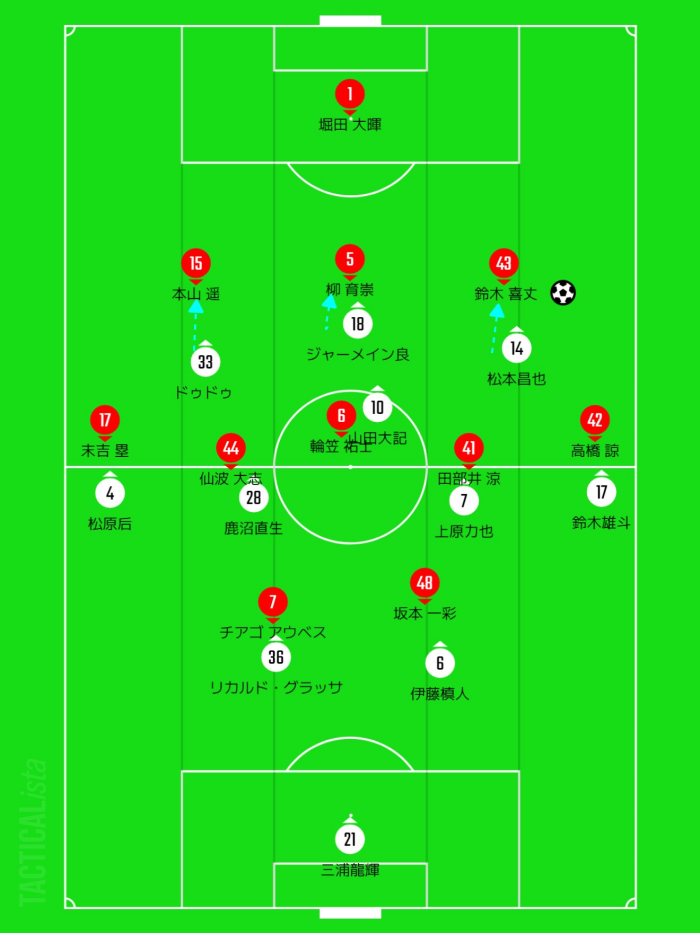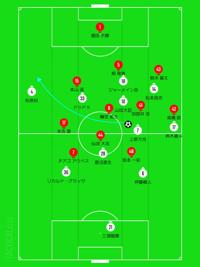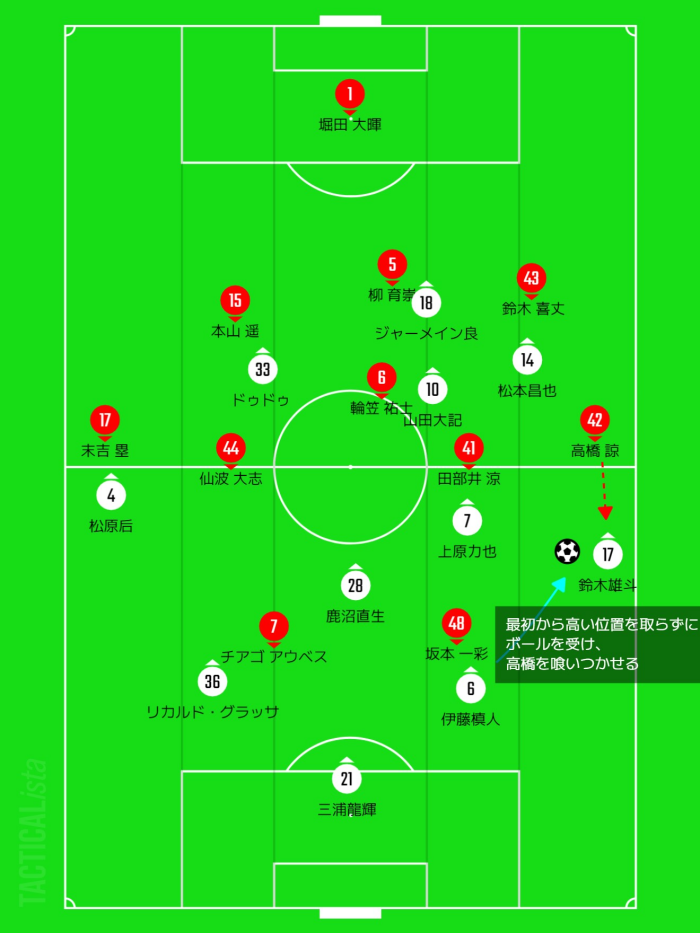 右からの攻撃は鈴木雄斗が最初から高い位置を取らずに、低い位置でパスを受けて高橋を喰いつかせます。