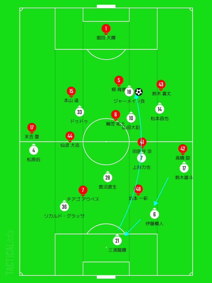 そして伊藤槙人・三浦龍輝へ下げてからのロングフィード。