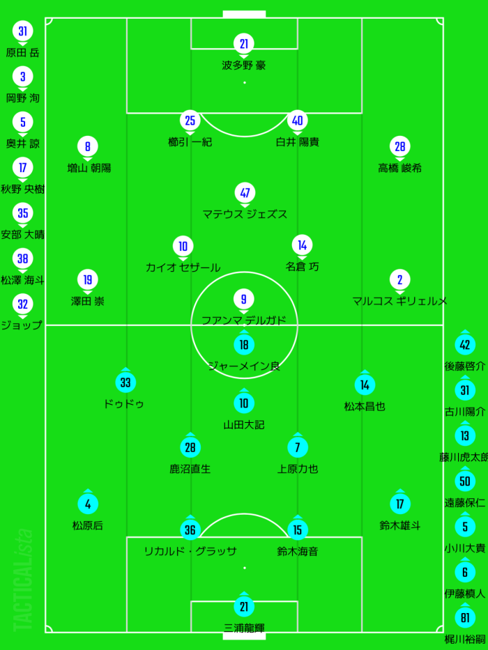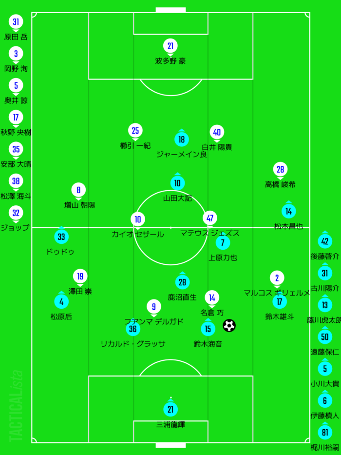 前回対戦で2ゴールした米田は前節欠場しており、今節戻ってくる可能性もありますが、スタメンは高橋を予想しました。
