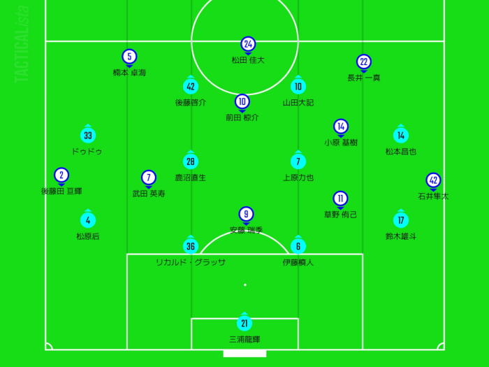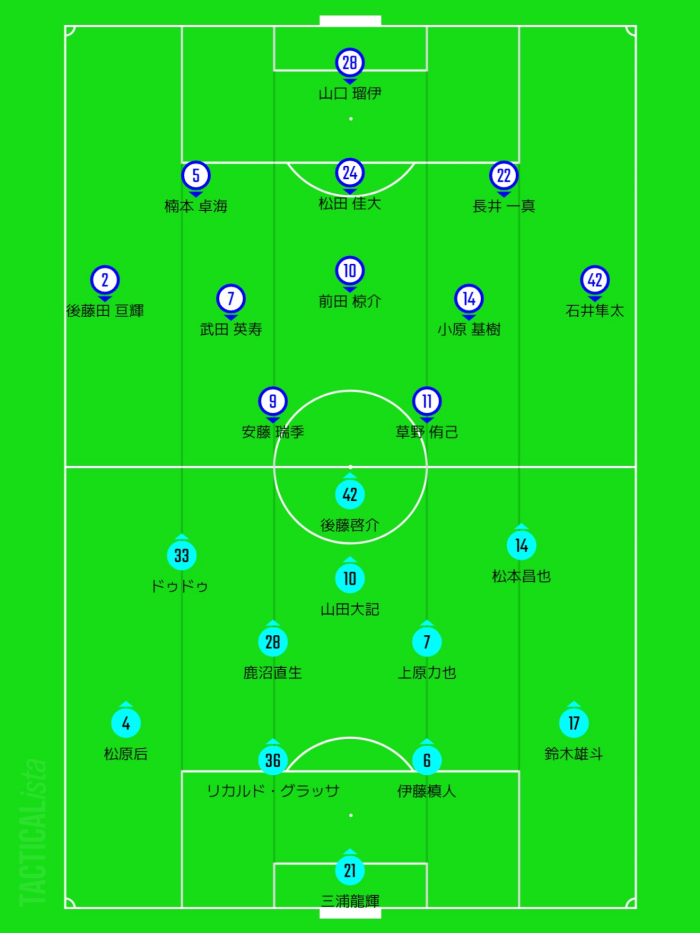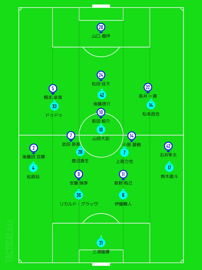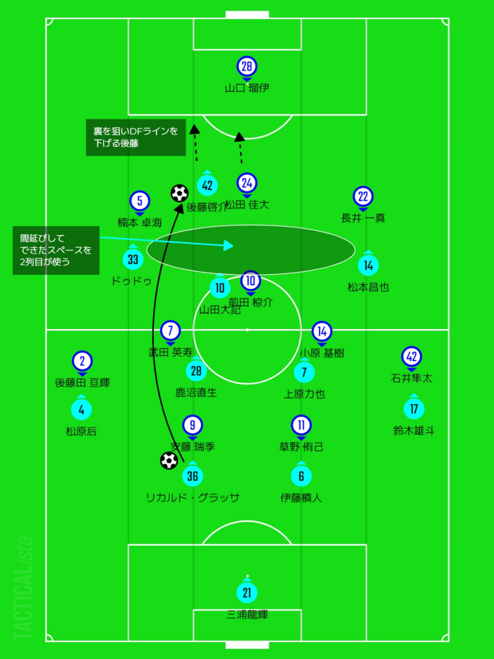 そしてDFラインと中盤の間のスペースを引き延ばし、そこを山田ら2列目が使う狙いで、グラッサ中心にロングボールを前線に蹴り込むことでハイプレスを打開。