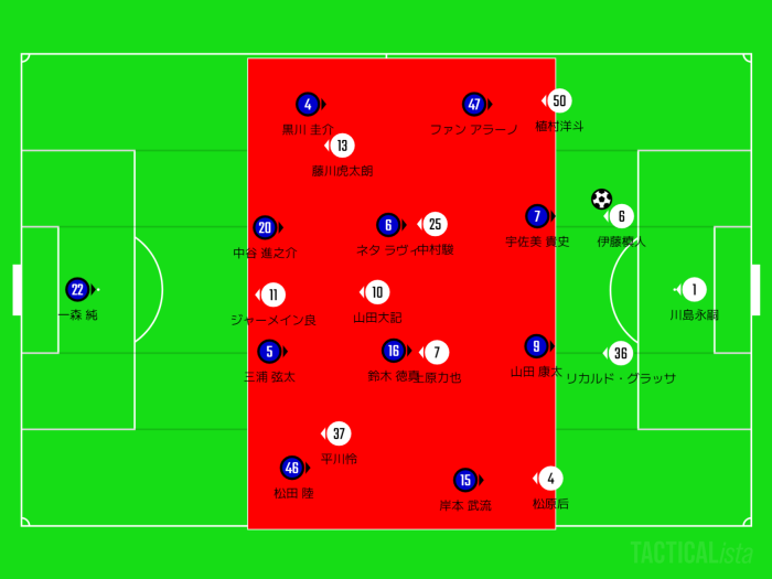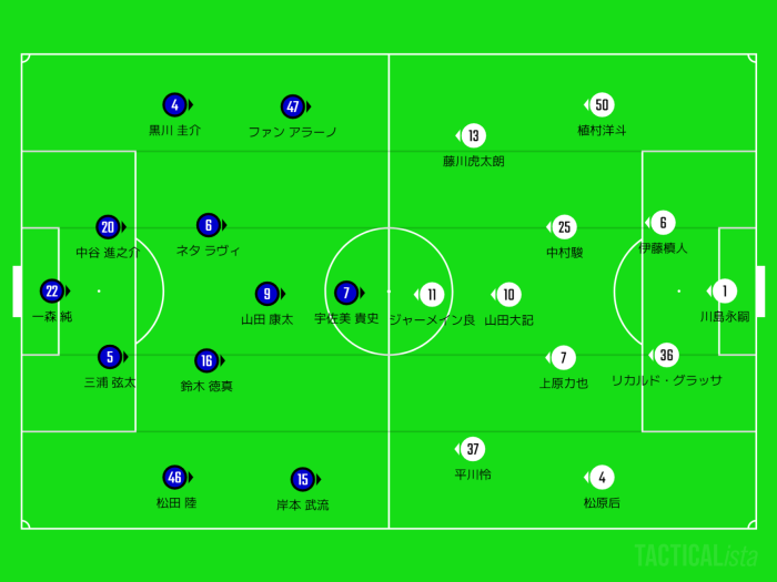 宇佐美・山田康太・ファンアラーノは自由に動き回り、相手DFの間で受けて起点を作り、サイドバックの攻撃参加も含めてサイド攻撃中心の印象。