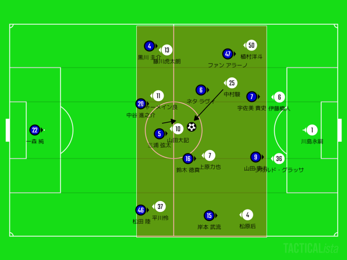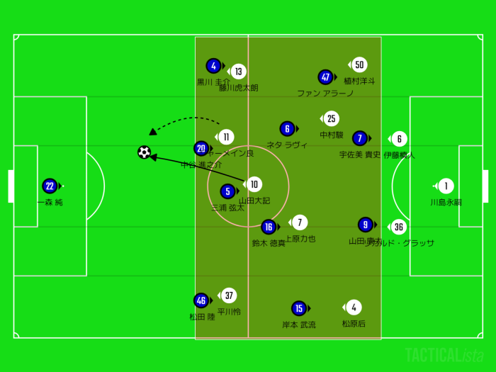 上の図のようにトップ下の山田大記にボールが入った場合、CBが前に出てくることも。