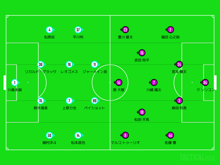 川﨑中心に両サイドへロングパスでの展開も多く、WGとサイドバックの連携でサイドを攻略するのが基本形のようです。