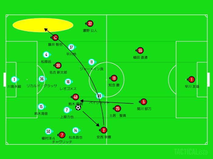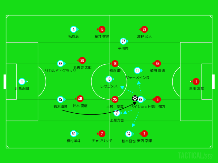 鹿島の攻撃は鈴木優磨、もしくはチャヴリッチに一度預けて、左で作って右サイドの藤井・濃野へ展開し、クロスというパターンが比較的多く見られました。