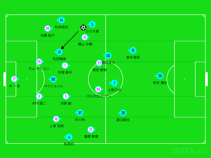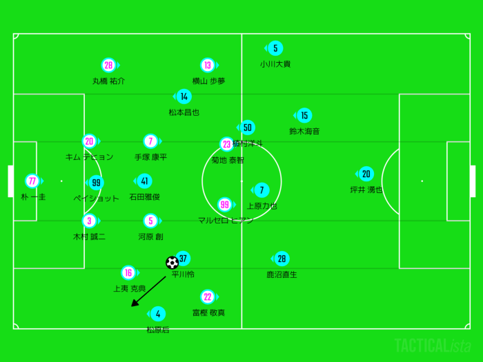 個人的には丸橋を上原に見させるようにマークを受け渡し、松本は小川大貴と2人で横山を潰しに行くべきだったと思います。