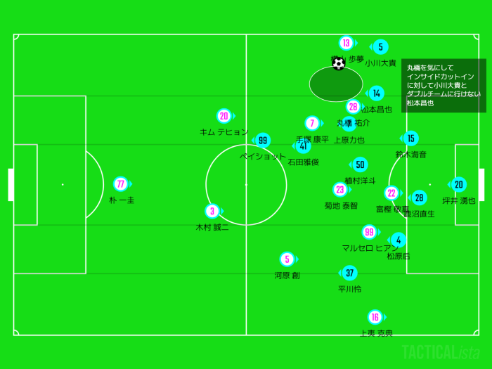 丸橋がハーフレーンに入ってきており、松本昌也はそこをケア。
