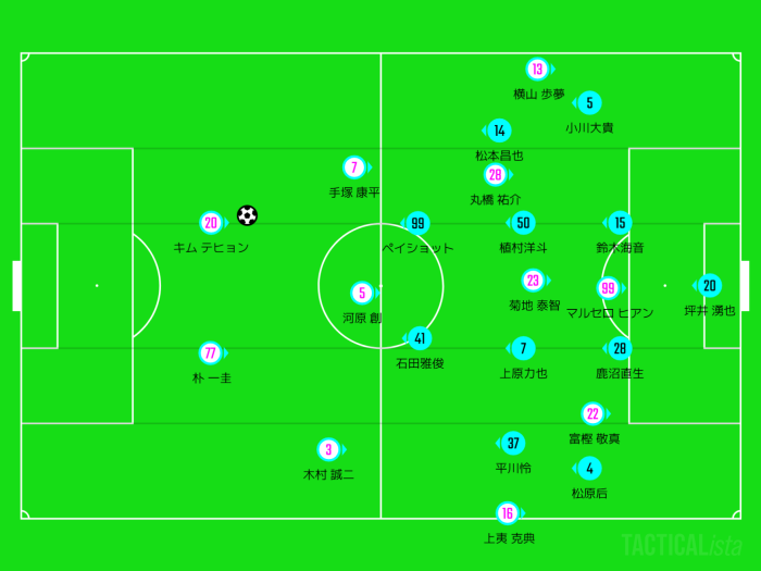 ペイショット・石田の守備タスクが軽いのもあり、キムテヒョンへプレスへ行かなかったペイショット。
