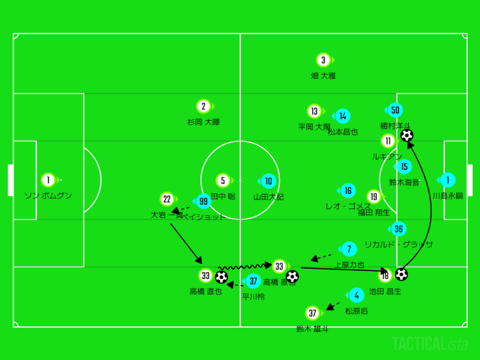 平川の所であっさり抜かれてしまったため、上原力也がボールホルダーに出て、