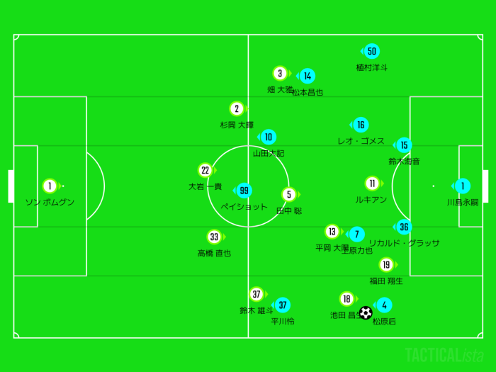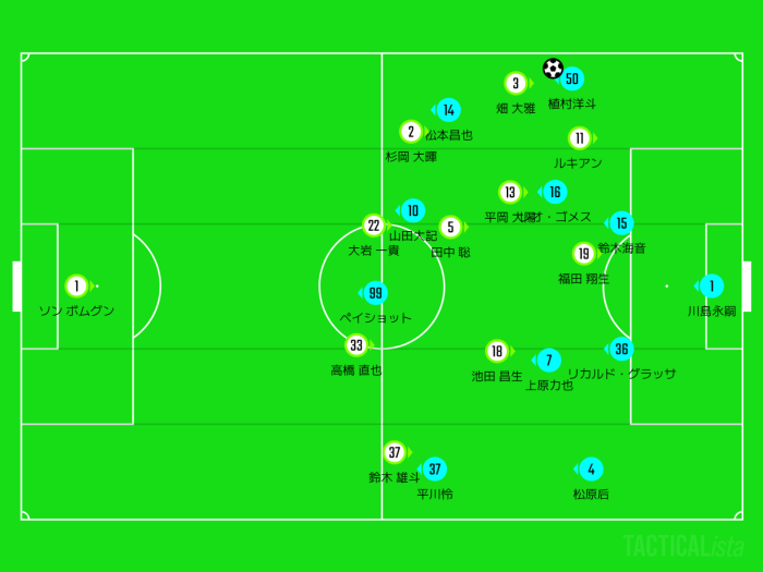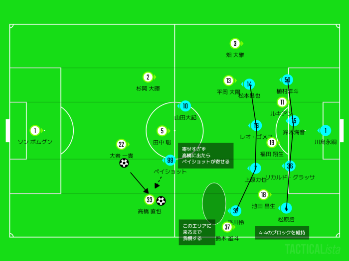 2失点するまではボランチの上原・レオゴメスが見る予定だったようですが、試合後インタビューで2失点後はCBが見る形に変えたようです。