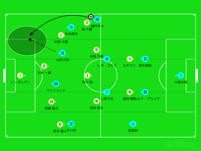 ブルーノ・ジョゼが裏へ出したボールにペイショットが走り、セカンドボールを金子翔太が収める。