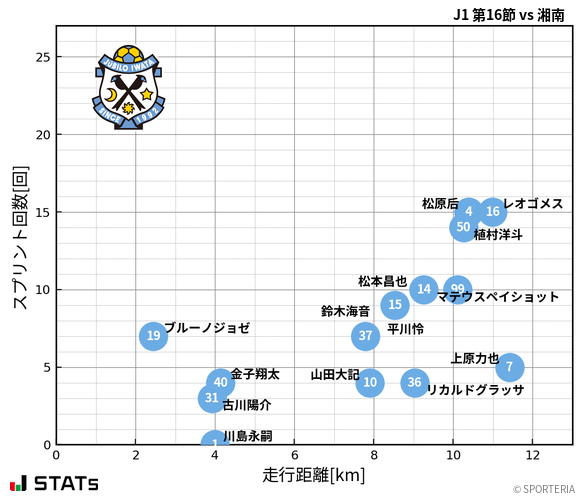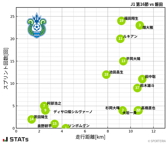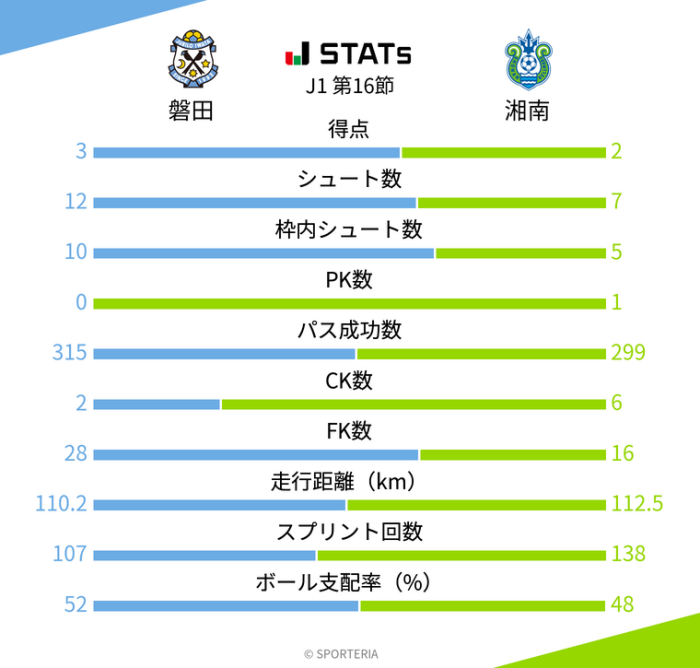 スタッツはスプリント回数は湘南が、シュート数は磐田が上回りました。