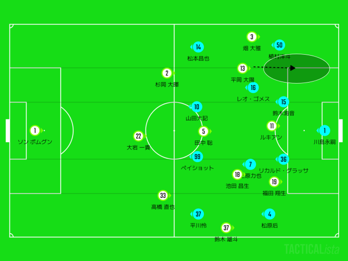 基本的にはペイショットに当てて、セカンドボールを2列目の平川・山田・松本で回収し、サイドを攻略する狙い。