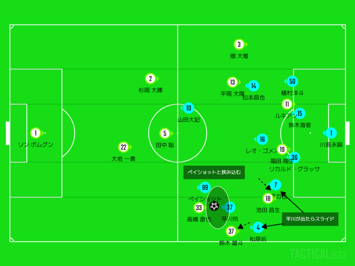 平川はもう少し我慢して抜かれない守備で自陣に引き込んでからプレスにいくべきだったかなと思います。