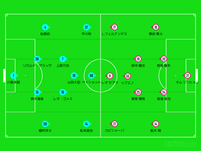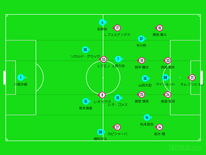 4-4-2のミドルプレスから前に圧力を強め、ハイプレス気味になることも。