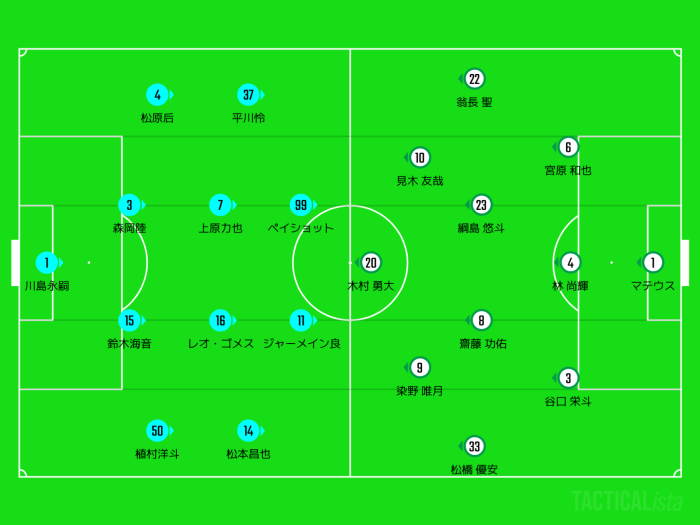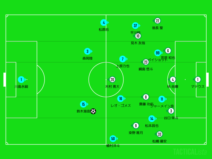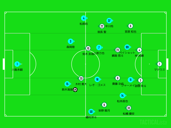 状況によっては右上がりにスライドして4-4-2に変形することも。