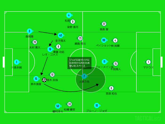 このプレーでヴェルディDFを左へスライドさせ、海音のパスコースを作り出しました!