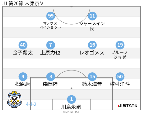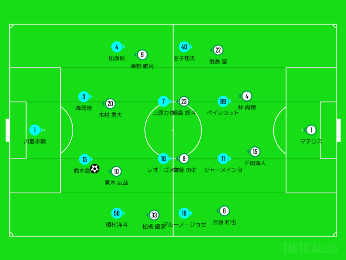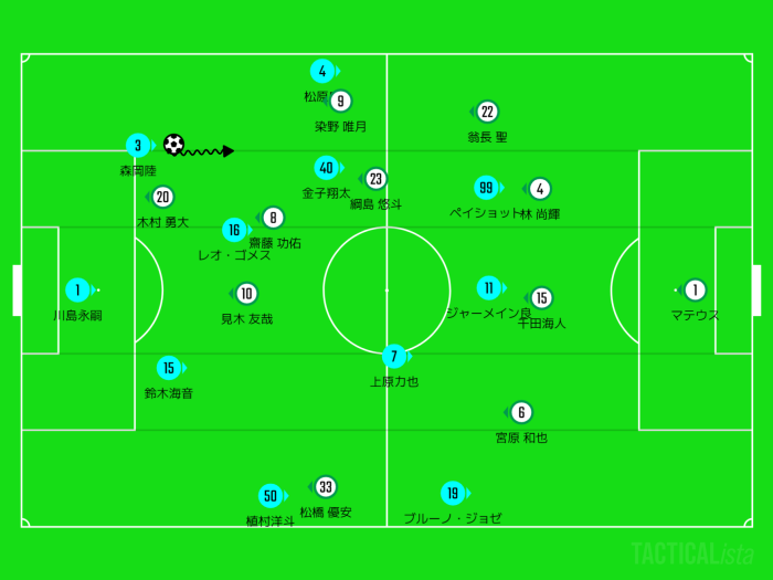 CBに森岡陸、右サイドハーフにブルーノジョゼ、左サイドハーフに自称"夏男"の金子翔太が入りました。