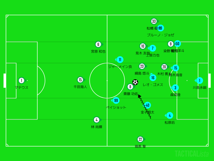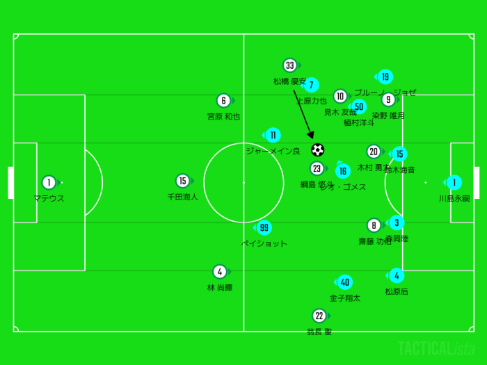翁長のスプリントに対して松原后・金子翔太・上原力也でよく連携して守ったと言えます。
