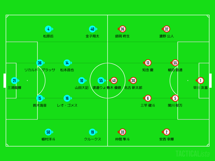 前節イエロー累積だった松原后が左サイドバックに戻り、右サイドバックに植村を予想。