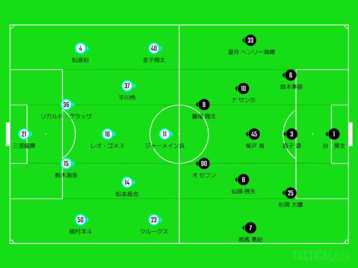 ポゼッションには拘らずオセフン・藤尾にロングボールを当ててサイドに展開するパターンが多いです。