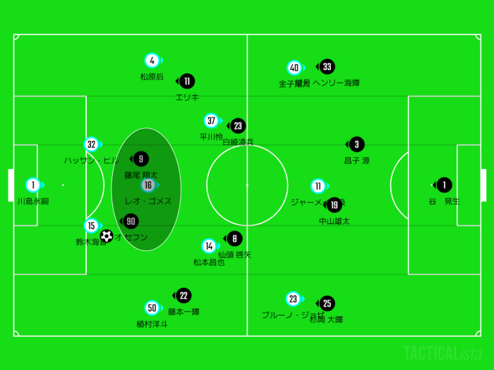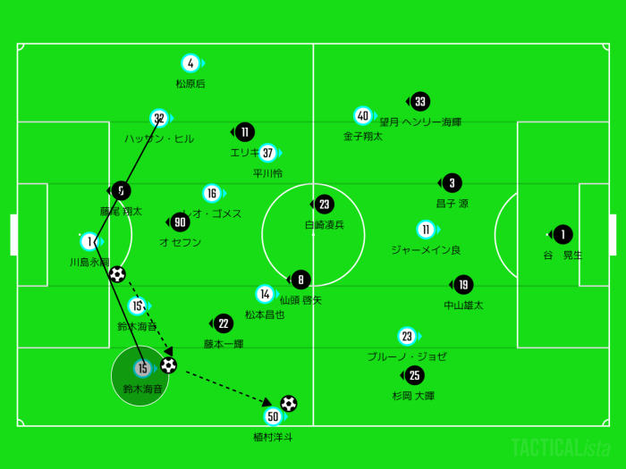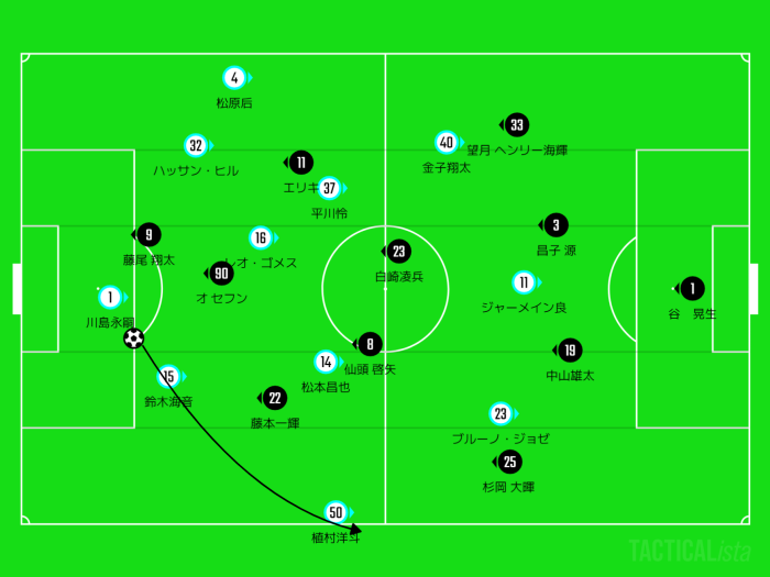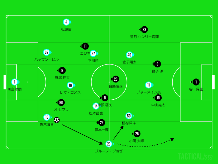 ここで海音がジョゼへパスを刺し込めばジョゼから植村へパスを入れてアタッキングサードへ入り込めそうな場面でしたが、海音はジョゼへパスを出さず。