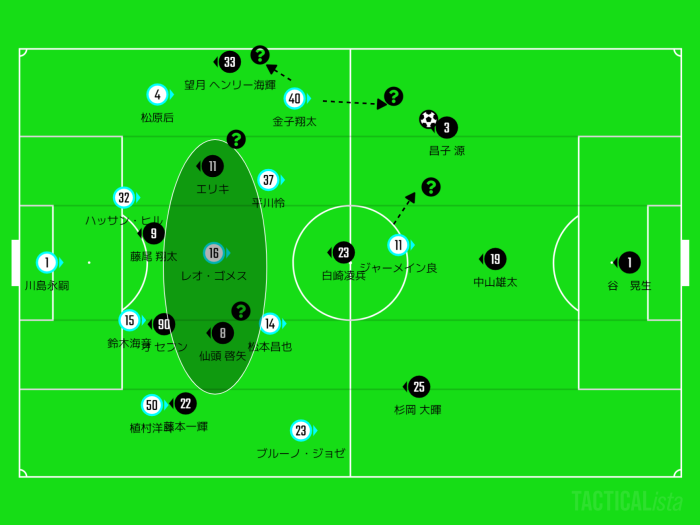 ビルドアップ時はヒル・川島、もしくはレオと三角形を形成してワイドに開いてボールを持ち出せばもっとビルドアップの起点になれると思うのに、中央3レーンからあまり出て行かない。