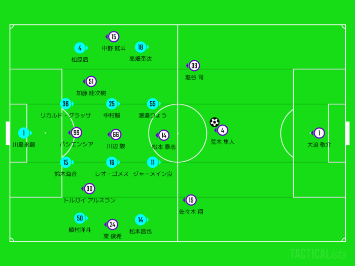 相手3バックがボールを保持している時に磐田のサイドハーフが吊り出されるとそこから崩してくるので、中を締める守備とセカンドボール回収がポイントになりそうです。