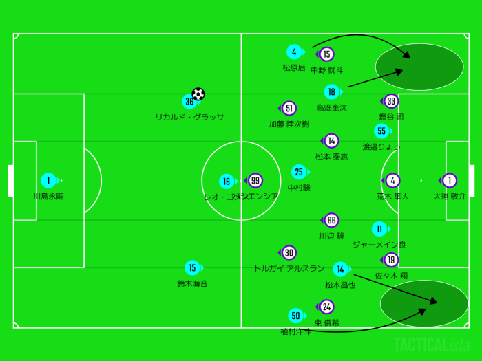 3バックの脇を突いて、クロスをニアで合わせる形を狙いたい。