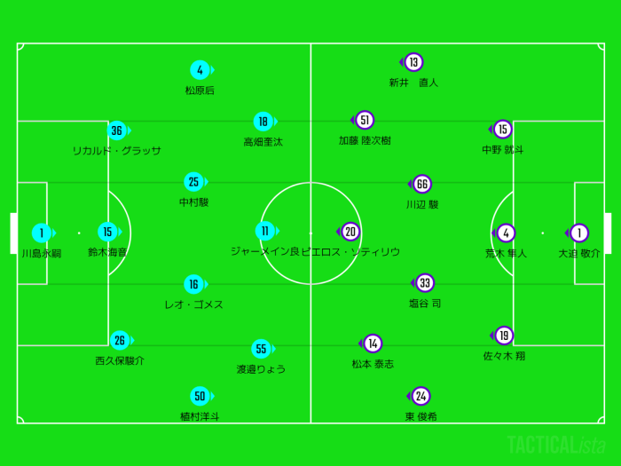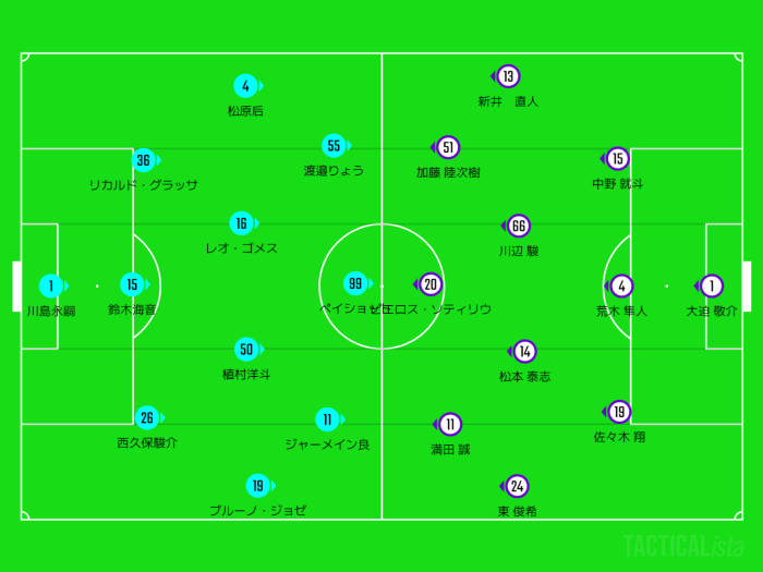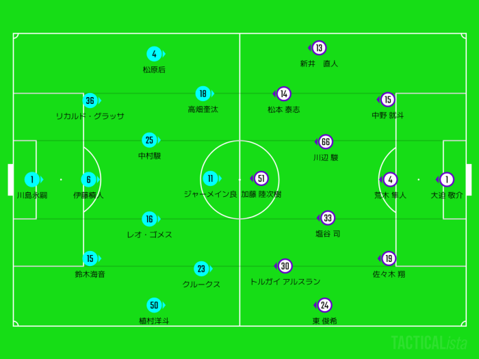伊藤槙人・鈴木海音がスタメン、3バックを組みました。
