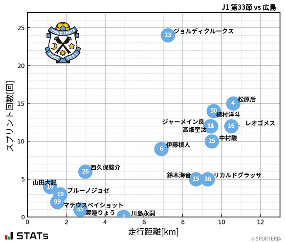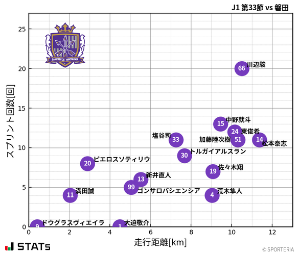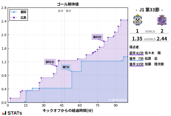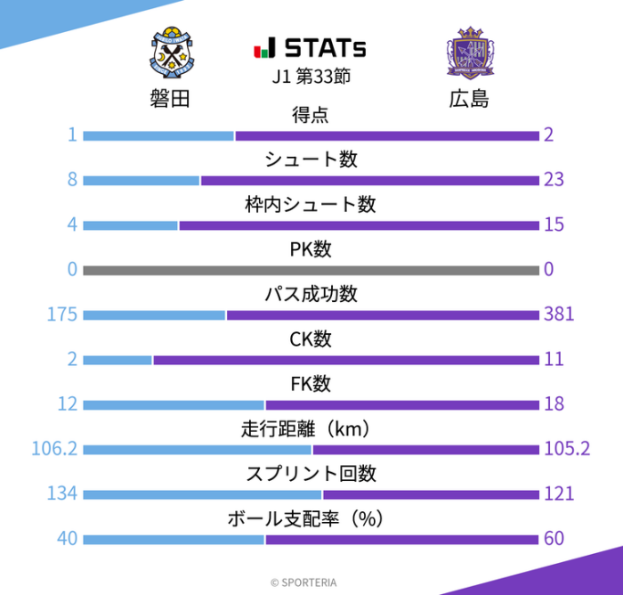 シュート、パスなどのスタッツは広島が大きく上回りましたが、走行距離・スプリント回数では磐田が上回りました。