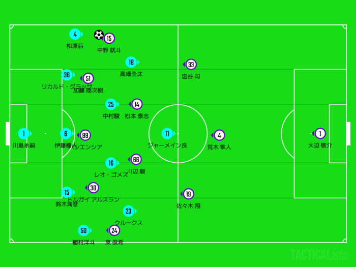 新井がRWB、中野がRCB、塩谷がボランチ、松本がシャドー、加藤をCFに配置換え。