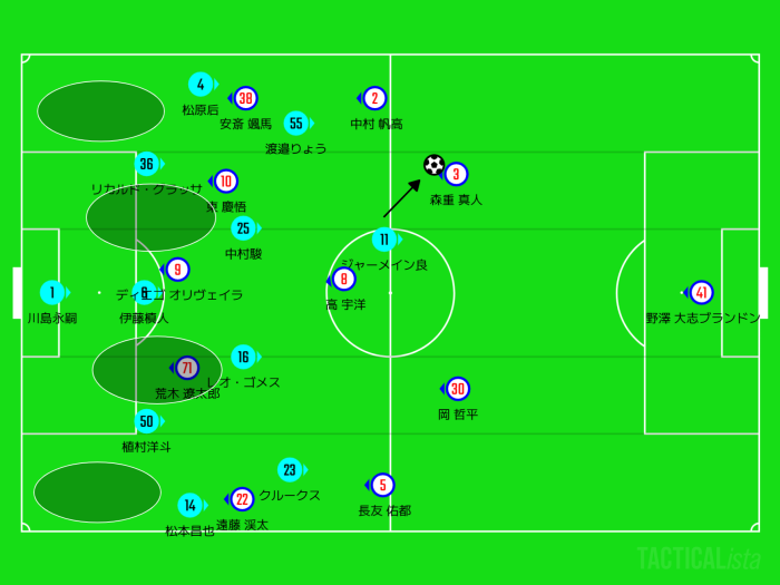 狙ってくるのは3バック脇のスペースと3バックの間のスペースでしょう。