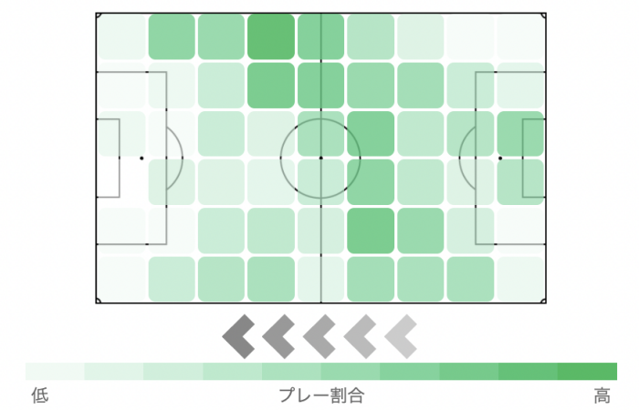 レッズ戦は45分のみのデータですが、こちらのほうがガンバ戦と比べて明らかに高い位置でプレーしていたが高いことがわかります。