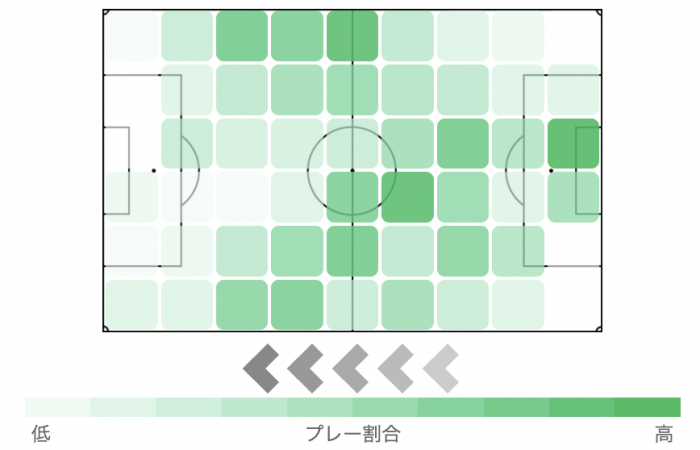 football-labのマッチレポートを見た所、前半と比べて後半は右の高い位置のプレー割合が高くなっています。