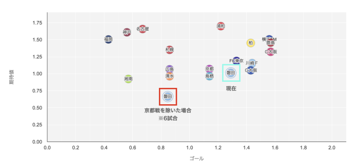 ただ4-1で勝利した京都戦がゴール数とxGの平均をかなり上げており(それぞれ+4と+3.053)、そこを除いて6試合平均で見ると、平均ゴール数「0.833」平均ゴール期待値「0.672」とかなり厳しい数字です。