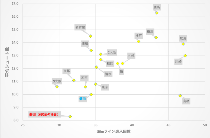横軸に「30mライン侵入回数」、縦軸に「平均シュート数」の散布図を作成してみました。