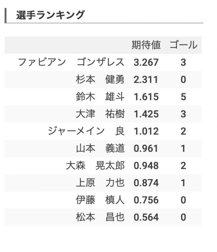 実際にチーム内ランキングを見ると、杉本以外の期待値上位の選手は上振れた結果が出ています。
