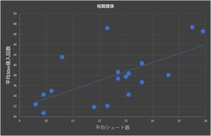 実際にJ1各チームの「平均30m侵入回数」と「平均シュート数」の相関を見ると「r=0.63」と正の相関がありました。