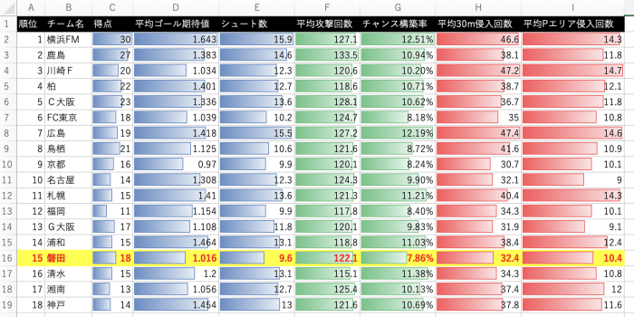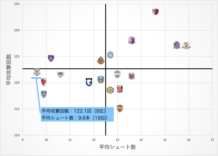 ・一方でシュート数がリーグ最下位。これは相手陣地へ攻め込んでいる回数が少ないためと思われる
