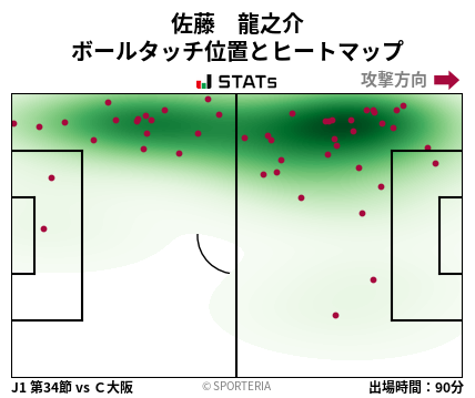 ヒートマップを見ると、佐藤選手は左サイドを中心に広い範囲でボールに関わっていることが分かる。特に相手陣内の高い位置でも多くタッチしていて、攻撃の起点として積極的に動いていたことがうかがえる。