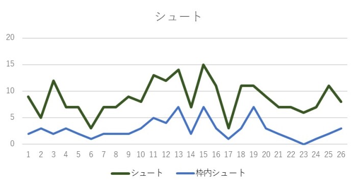 注目してほしいのは、シュートと枠内シュートの本数の違いだ。20節以降は、シュートの数は今までと変わらないものの、枠内シュートが減り、2つの折れ線の差が大きくなっている。