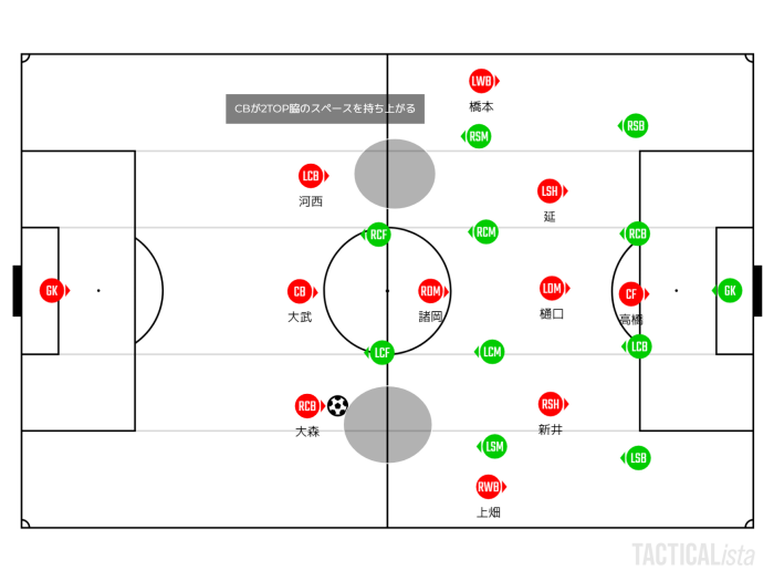 樋口選手がWボランチと2センターバックの間のバイタルに入る。