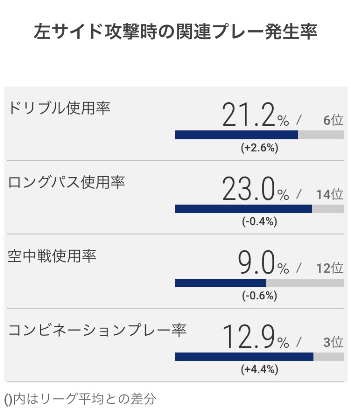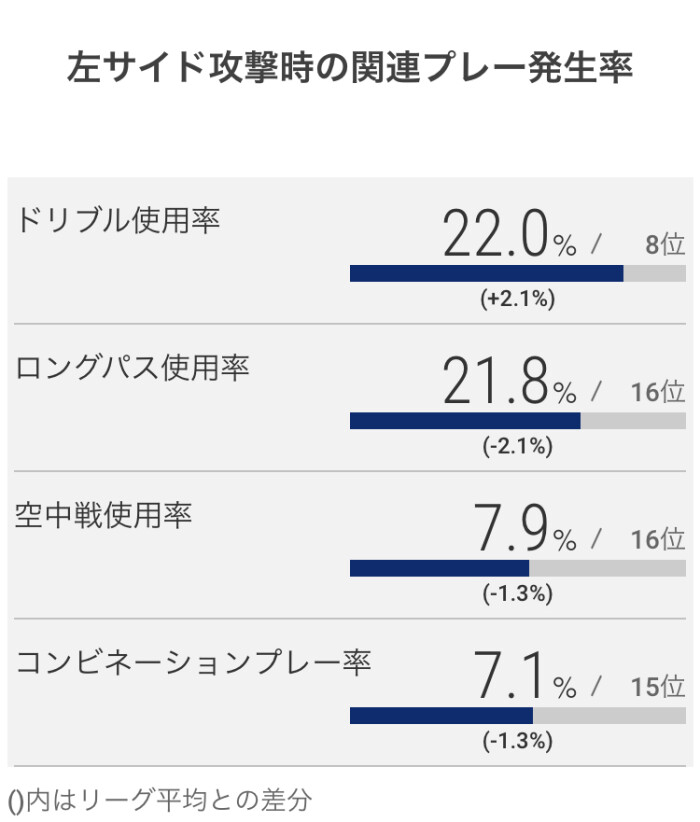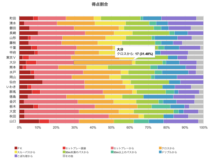 クロスからの得点割合は、東京Vの約26%を除けば他は10%後半から20%前半なので、突出した数値であると言えます。